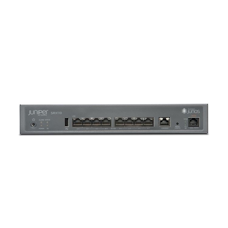 SRX110H2-VA: passarel·la de serveis SRX 110 amb 8 ports FE, 2 G de RAM i Flash, 1 port VDSL2/ADSL2+ sobre POTS, port USB per a la connectivitat de mòdems mòbils. PS i cable externs inclosos.